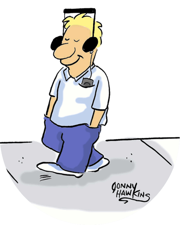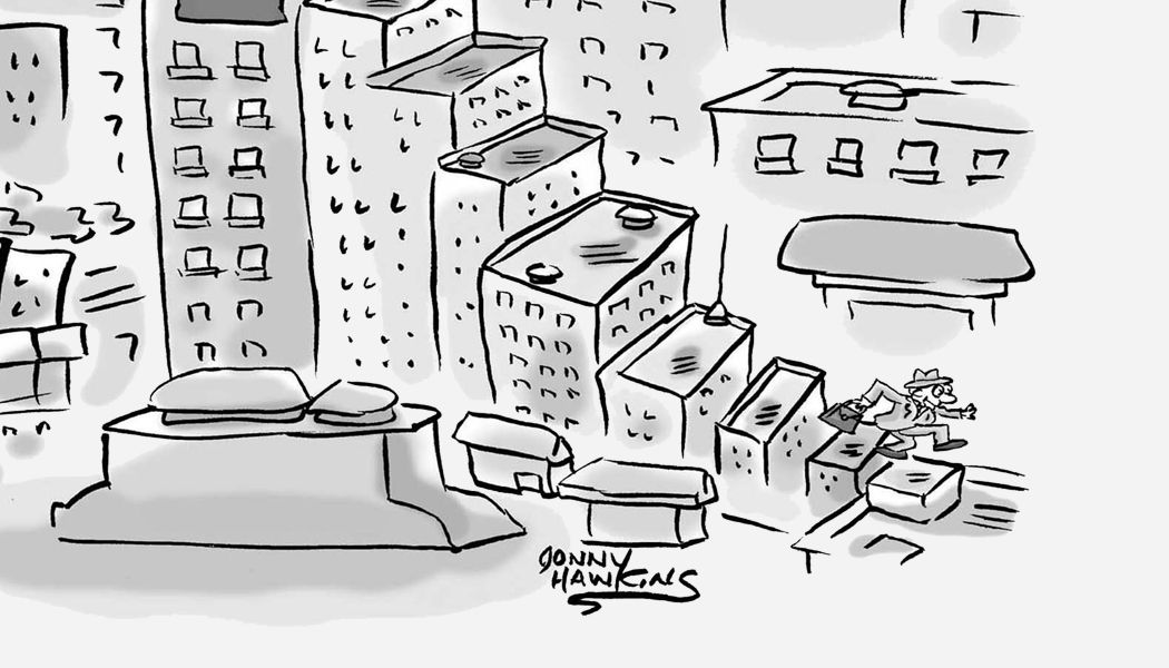 Jonny Hawkins enjoys a bird’s-eye view of life and the city streets all through a single frame. He has been freelance cartooning since 1986, starting with pen-and-ink from his country home perch in Sherwood, Michigan. He then went from a Detroit suburb to downtown Detroit in 1990, the same year he went full time. It was later back to the country, where he has been penning his single-panel cartoons the past 30 years, selling to over 900 publications. He has drawn more than 50,000 cartoons, and his comic “Street Scene” is a celebration of the cacophony of humanity in the city … all while being completely silent.